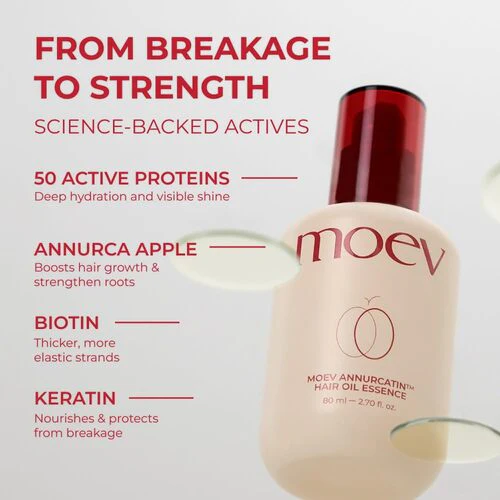 MOEV’s Annurcatin Hair Oil Essence is a nourishing treatment designed to strengthen, protect, and revitalize dry or damaged hair. Powered by the brand’s signature Annurcatin™ complex, a blend of annurca apple extract and biotin, the formula helps improve hair elasticity and thickness while supporting healthy hair growth. With regular use, it helps transform dull, fragile strands into smoother, shinier, and more resilient hair.